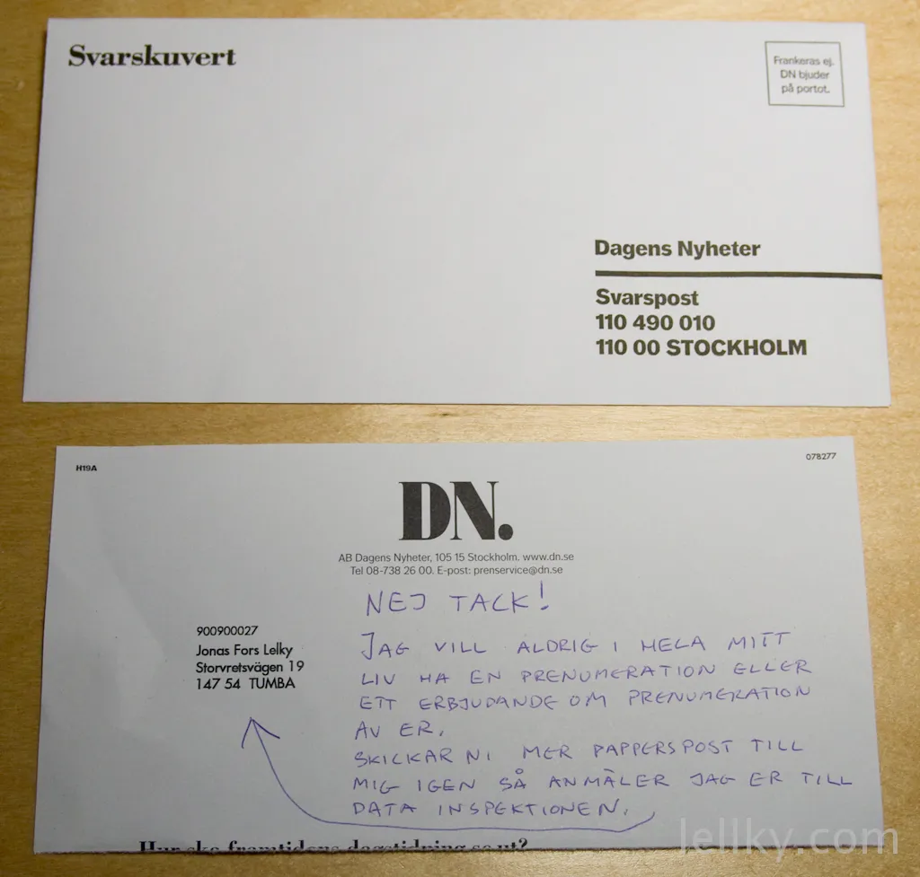 DN är ett av de företag som skiter fullständigt i att man inte vill ha deras utskick om “bra erbjudanden”. Därför är det inte mer än rätt att man utnyttjar det förbetalda porto de betalt och skickar tillbaka utskicket till dem i deras eget kuvert. Tråkigt för miljön -jag vet- men hur ska man annars få dem att fatta?!