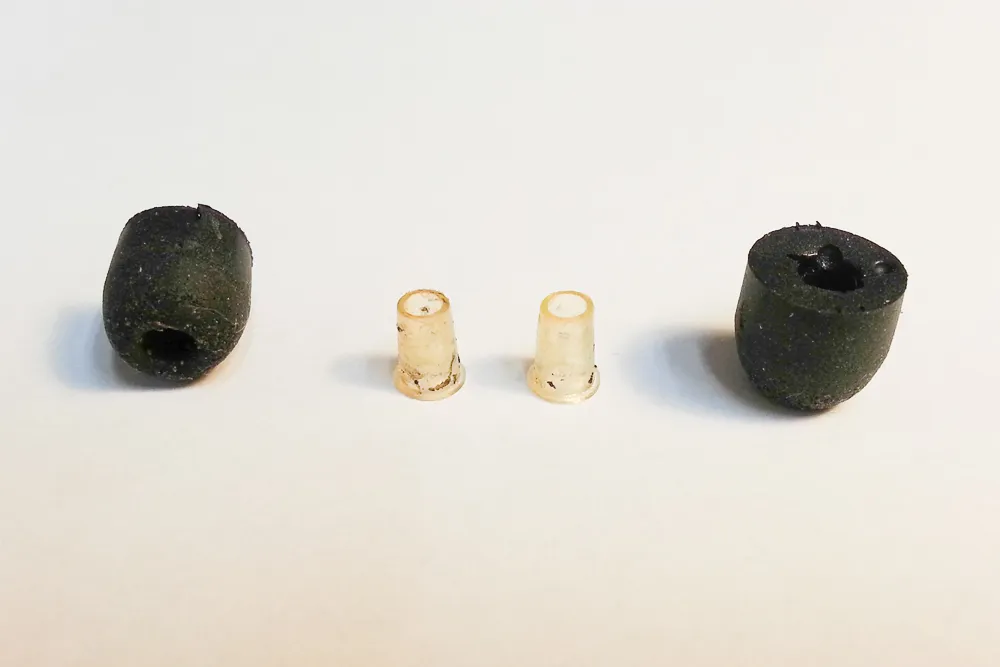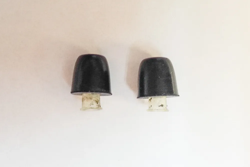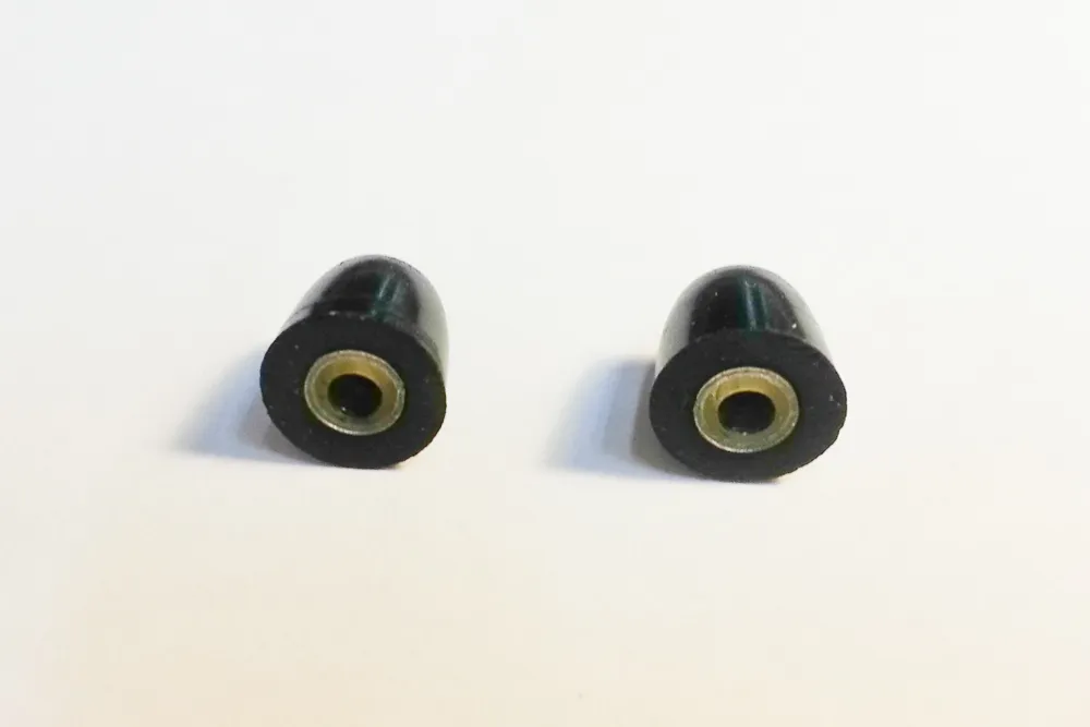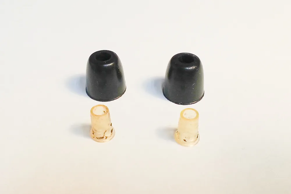 Ta först bort kuddarna från hörlurarna genom att dra och vrida samtidigt. Riv sedan loss kuddarna från de små plaströren och pilla bort alla små rester av foam och lim.